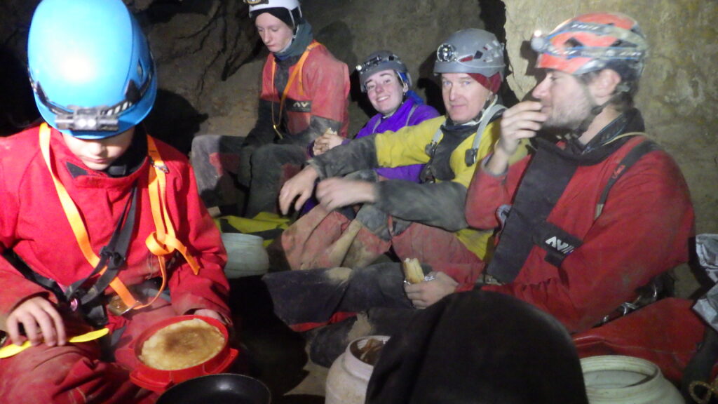 La cavité révéla rapidement ses atouts : des volumes impressionnants qui ne manquèrent pas de captiver l’ensemble du groupe. Tout le monde se retrouva au pied du puits pour poursuivre la progression jusqu’à la salle du Réveillon, où nous retrouvons les spéléologues suisses arrivés avant nous. Une belle salle qui donnerait presque envie d’y allumer plein de bougies…