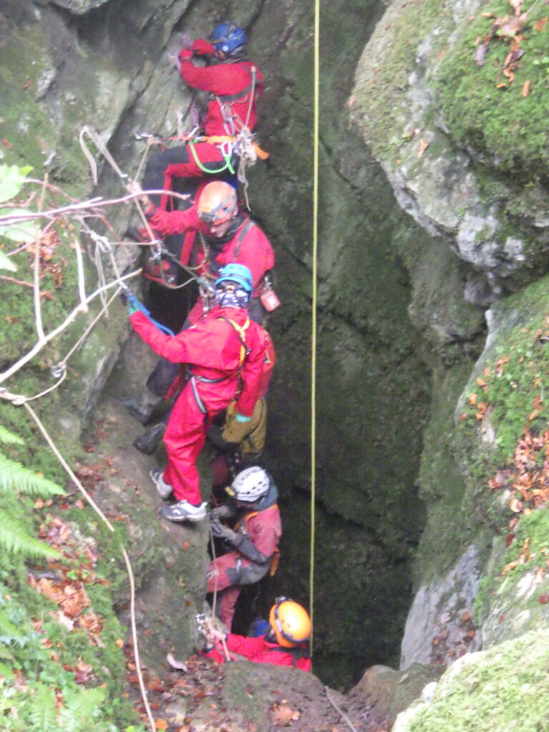 Charline équipa l’entrée en installant la main courante menant au P40, toujours sous l’œil attentif de Jean-Marc. Pendant ce temps, Thomas dispensait aux novices un rappel sur l’utilisation de la main courante et du descendeur.